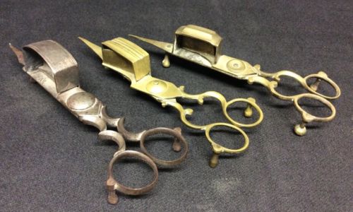 3ANTIQUE EARLY 1900s BRASS CANDLE WICK TRIMMER SNUFFER SCISSORS
