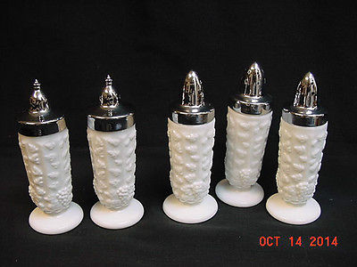 Title (ebay affiliate link): 5 Westmoreland White Milk Glass Paneled Grape Salt & Pepper Shakers 2 Sets + 1
