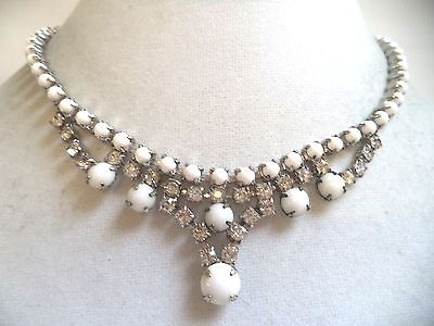 GORGEOUS VINTAGE SILVER TONE HIGH END MILK GLASS RHINESTONE NECKLACE!!! 4782A
