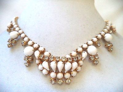 STUNNING VINTAGE ESTATE GOLD TONE HIGH END MILK GLASS RHINESTONE NECKLACE! G533