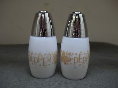 VTG Retro Corelle Corning Pyrex White Milk Glass P+P Shaker Set Gold Butterflys