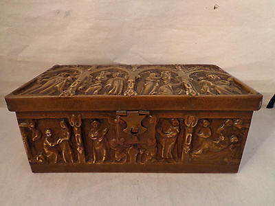 Antique Gothic Midieval Repousse Brass Figural Casket Coffer Box Made in Belgium