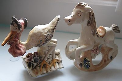 Vintage Capodimonte Porcelain Figurine Lot of 2 Stork at Chimney & Rocking Horse