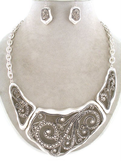 Title (ebay affiliate link): CHUNKY ANTIQUE SILVER CRYSTALS METAL ART NECKLACE SET