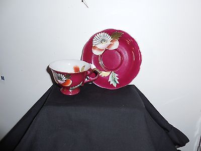 HAND PAINTED CHINA CUP AND SAUCER BEAUTIFUL FLORAL AND DEEP RED COLOR