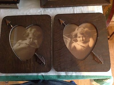 CUPID ASLEEP AWAKE VALENTINE HEART PICTURE FRAME CHERUB ANTIQUE MISSION ARTS