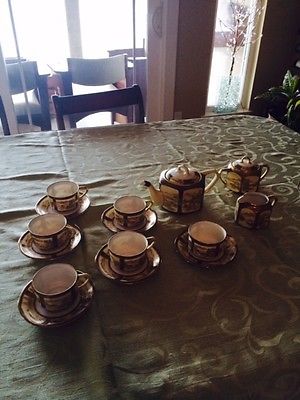Title (ebay affiliate link): Vintage 6 Cup Handpainted Nippon Tea Set. Gold and Brown Ornate Pattern