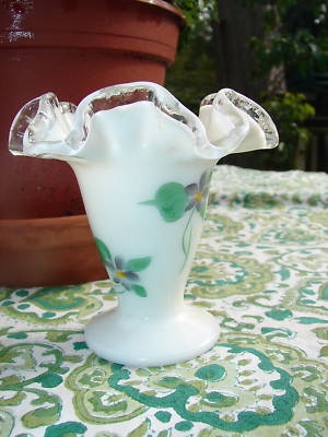 SMALL VINTAGE FLUTED MILK GLASS VASE W/ VIOLET FLOWERS