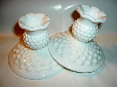 2 Fenton Milk Glass Hobnail Candlestick Holders #3974MI