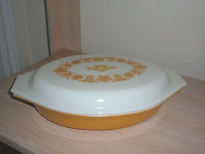 Vintage 1970's "Butterfly Gold" Pyrex Oval Divided Casserole & Milk Glass Lid