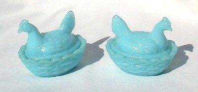 Blue Milk Glass Hen on Nest Miniature Salt Dips TWO