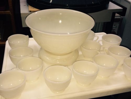 Title (ebay affiliate link): ANCHOR HOCKING Milk Glass Punch Bowl Set with Base 10 Cups