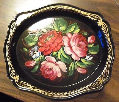 Vintage Tole Painted FLORAL Flower Toleware Metal Tray