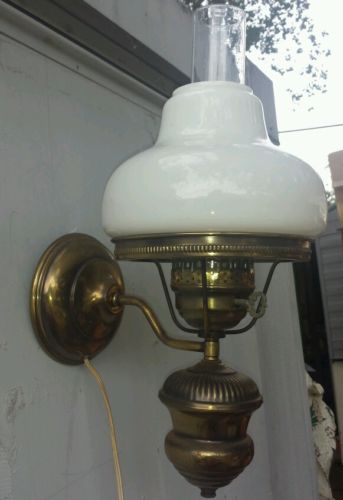 Title (ebay affiliate link): VINTAGE WALL HANGING HURRICANE LAMP LIGHT BRASS WHITE MILK GLASS SHADE ELECTRIC