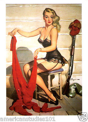 Title (ebay affiliate link): Postcard Risque Pin-Up Girl Who Me? Gil Elvgren 1952 Hard to Suit Hunter