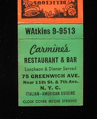 Title (ebay affiliate link): 1940s Matchbook Carmine's Restaurant & Bar 75 Greenwich Ave. near 11th St NYC NY