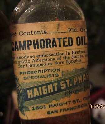 Title (ebay affiliate link): Antique Oil Bottle from Haight St. Pharmacy of San Francisco w Original Contents