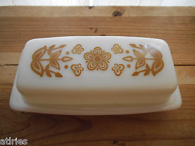 EUC Pyrex 2 Pc Butterfly Floral Gold Harvest Butter Dish Milk Glass Corelle 72-B