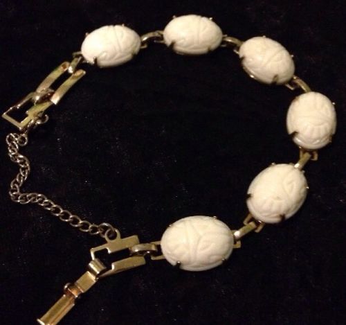 Vintage White Milk Glass Scarab Bracelet Costume Jewelry
