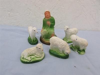 Vintage Christmas 1940's Chalkware Nativity Shepherd & Flock of Sheep
