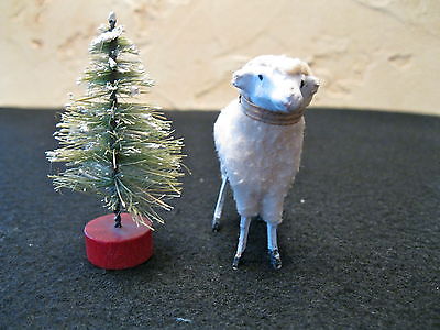 Antique German Putz Christmas Stick Leg Wooly Sheep ( 2") with Bottle Brush Pine