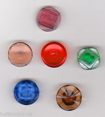 6 DEPRESSION ERA CLEAR COLORED GLASS BUTTONS