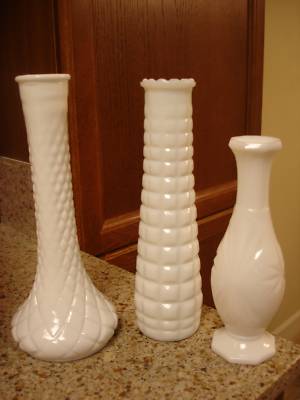 3 MILK GLASS FLOWER VASES ALL SEEN INCLUDED NO DAMAGE