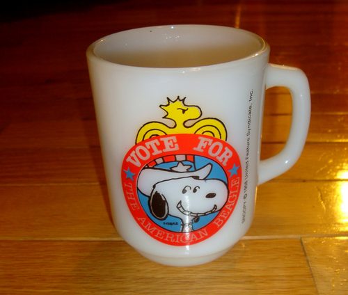 Snoopy Fire King Milk Glass Mug Vote for The American B