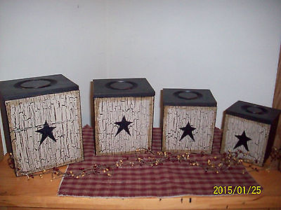 PRIMITIVE CRACKLE BLACK STAR WOOD 4 PIECE CANISTER SET COUNTRY FARMHOUSE DECOR