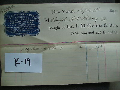 JAS J. MCKENNA BRO, NEW YORK 1892 RECEIPT TO STAMFORD STREET RAILWAY LOT K-19