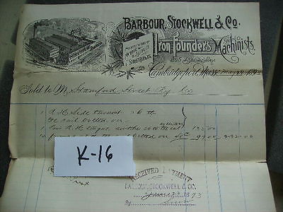 BARBOUR STOCKWELL & CO CAMBRIDGEPORT MA 1893 RECEIPT TO STAMFORD STREET RY K-16