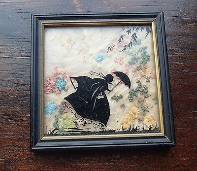 Title (ebay affiliate link): Vintage Fisher Reverse Painted Milkweed Silhouette Girl with Umbrella 4" Square