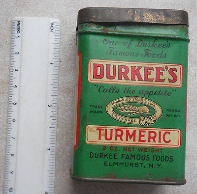 Title (ebay affiliate link): Vintage Green 2 oz. Durkee's Tumeric Spice Tin: Elmhurst, NY