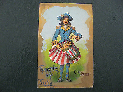 Title (ebay affiliate link): Patriotic~Lady Colonial Dress Uniform~Beats Drum~4th July Glitter~Gold~postcard