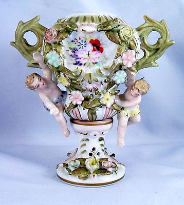 Antique Dresden Porcelain Vase Cherubs & Flowers Miniature 2-Pc Bolted CHARMING!