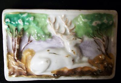 Very Old Decorative Tile of Stag with Trees in Relief Approx. 2 x 3 inches