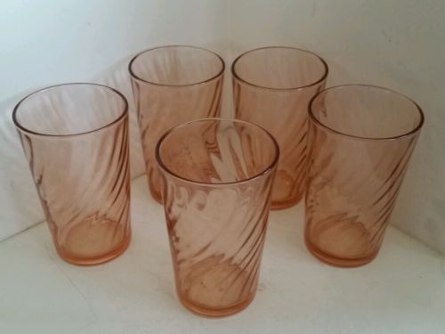 Title (ebay affiliate link): 5 Beautiful Pink Rosaline swirl 8 oz juice glass tumblers Arcoroc France
