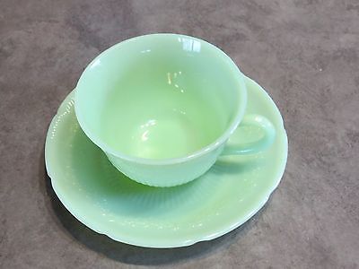 Jadite Fire King "ALICE" Cup & saucer set,Embossed Floral Design.