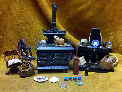 Title (ebay affiliate link): Antique Dollhouse Lot Wood Cast Iron Stove Fireplace Furniture Kitchenware Decor