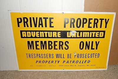 Vintage No Trespassing Sign Private Property ADVENTURE UNLIMITED Members Only