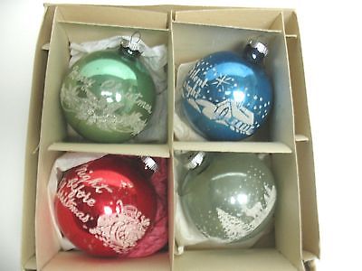 Title (ebay affiliate link): BOX VINTAGE GLASS ORNAMENTS WITH VENETIAN DEW SILK SCREEN DESIGNS BY SHINY BRITE