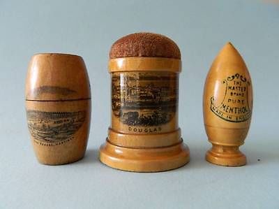 3 Mauchline Ware Wood Treen Thimble Cases Sewing Pin Cushion Sterling Silver