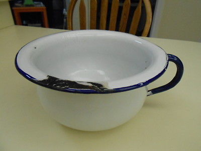 Antique Child's Enamelware Chamber Pot w/ Handle & Blue Trim