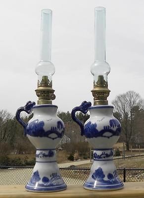 Vintage Pair Oriental Style Blue & White Porcelain Oil Lamps w/ Dragon Handles