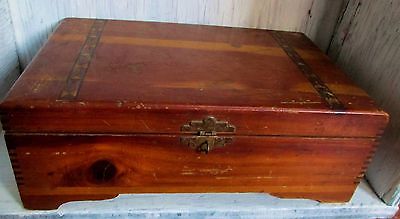 Vtg 11" OLD Handmade ? Carve Antique Wood BOX TREASURE CHEST Pirate Inlay Metal