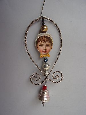 Title (ebay affiliate link): ANTIQUE WRAPPED WIRE GLASS BEADED BELL & PAPER CHILD'S HEAD CHRISTMAS ORNAMENT