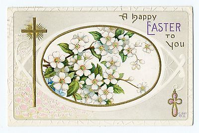 White Flowers^Cross^Happy Easter^Early 1900s Vintage Postcard Embossed