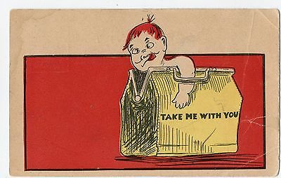 Funny Guy In Luggage^Take Me With You^Early 1900s Comic Greeting Postcard