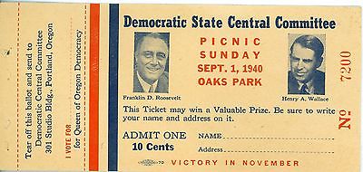 Vintage 1940 Roosevelt Wallace Oregon Democratic State Picnic Ticket