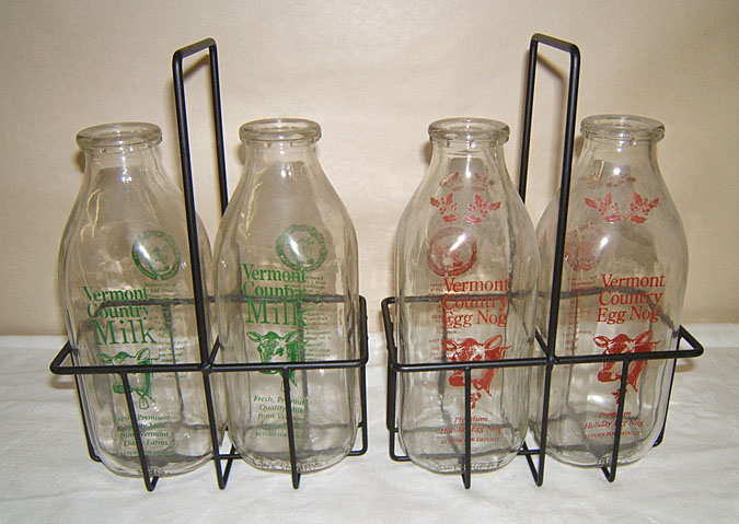 4 Old milk bottle 2 wire carriers Vermont egg nog NR